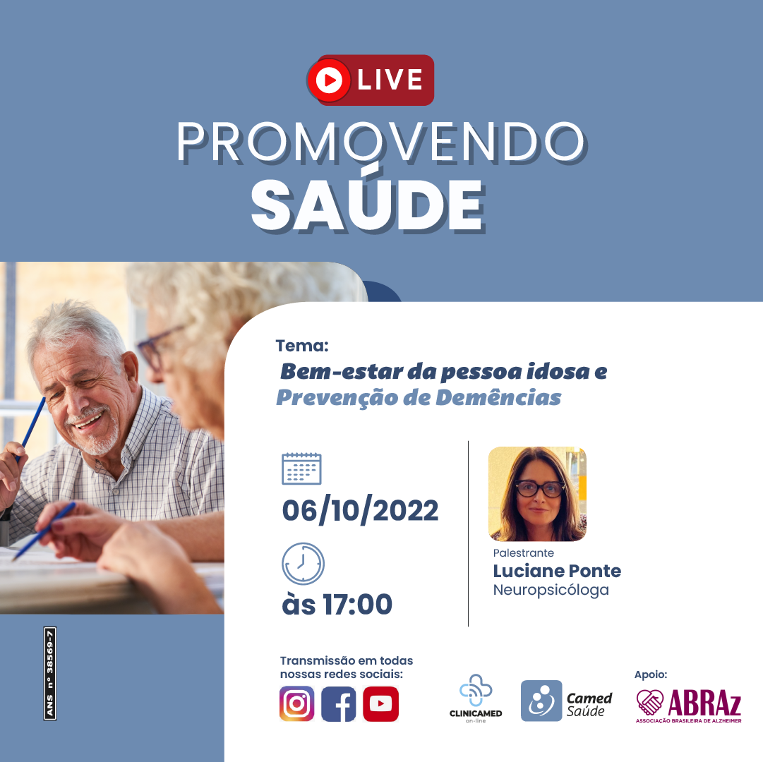 Não perca nossa Live Promovendo Saúde com a Neuropsicóloga Luciane Ponte para falarmos sobre o bem-estar da pessoa idosa!