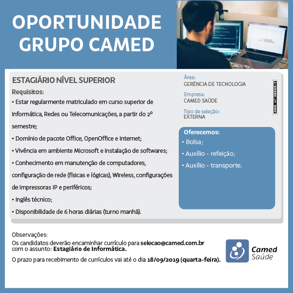Camed Saúde seleciona Estagiário de Nível Superior em Tecnologia da Informação em Fortaleza/CE. Inscreva-se!